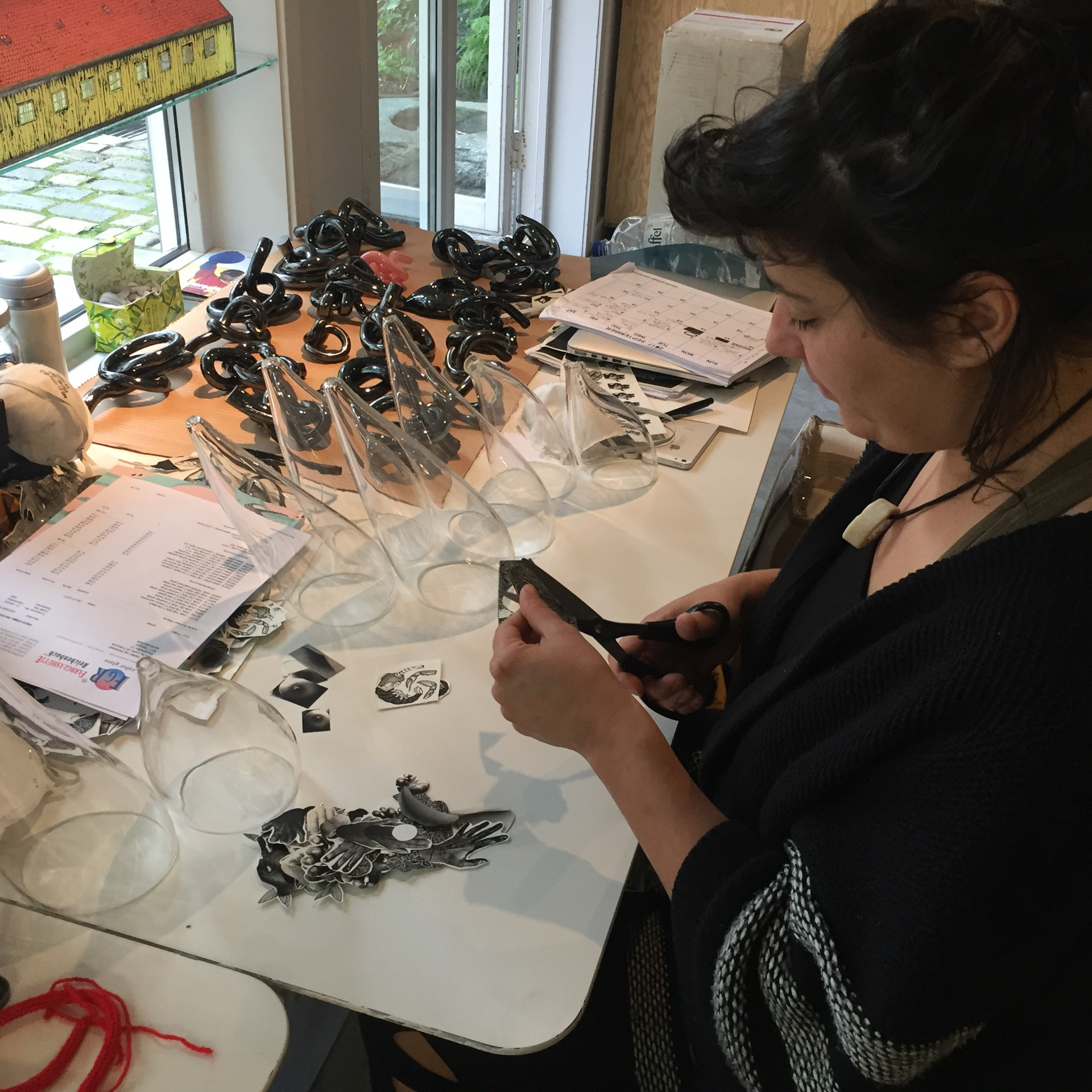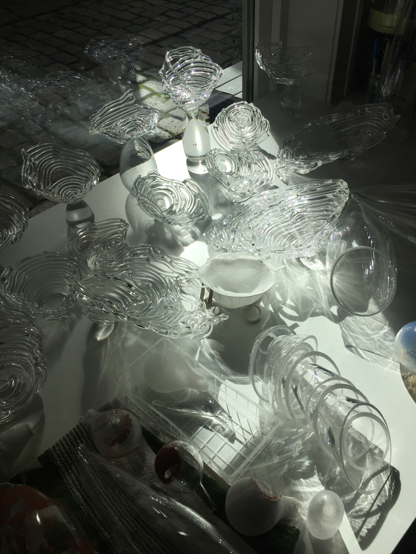I have chosen fish and plankton as symbols for life and the sea in my installation. On the ground, a vortex of clear water represents my comfort, my cocoon of safety as a white western woman. This clear water will be surround by a circle of defense, a fence between me, my body and all the rest: pollution, exploitation, and overfishing. Those defenses are built of plastic bottle shapes, it is my opinion that this object is a demonstration of our madness, the sale of clear water in petrol made container. It is also a reminder of the massive amount of plastic present in our ocean. On the other side of my fence, black oily water, and a school of fish without heads (fish ghosts). In suspension just over my vortex, my ego portrait made of selfies on bubbles of glass. And out of my stomach comes net made of intestine, with nodes at the extremity, because at my point of view, the way we eat is the nodes of the consummation problem.