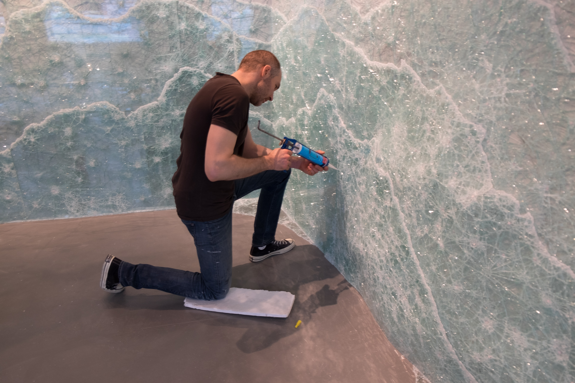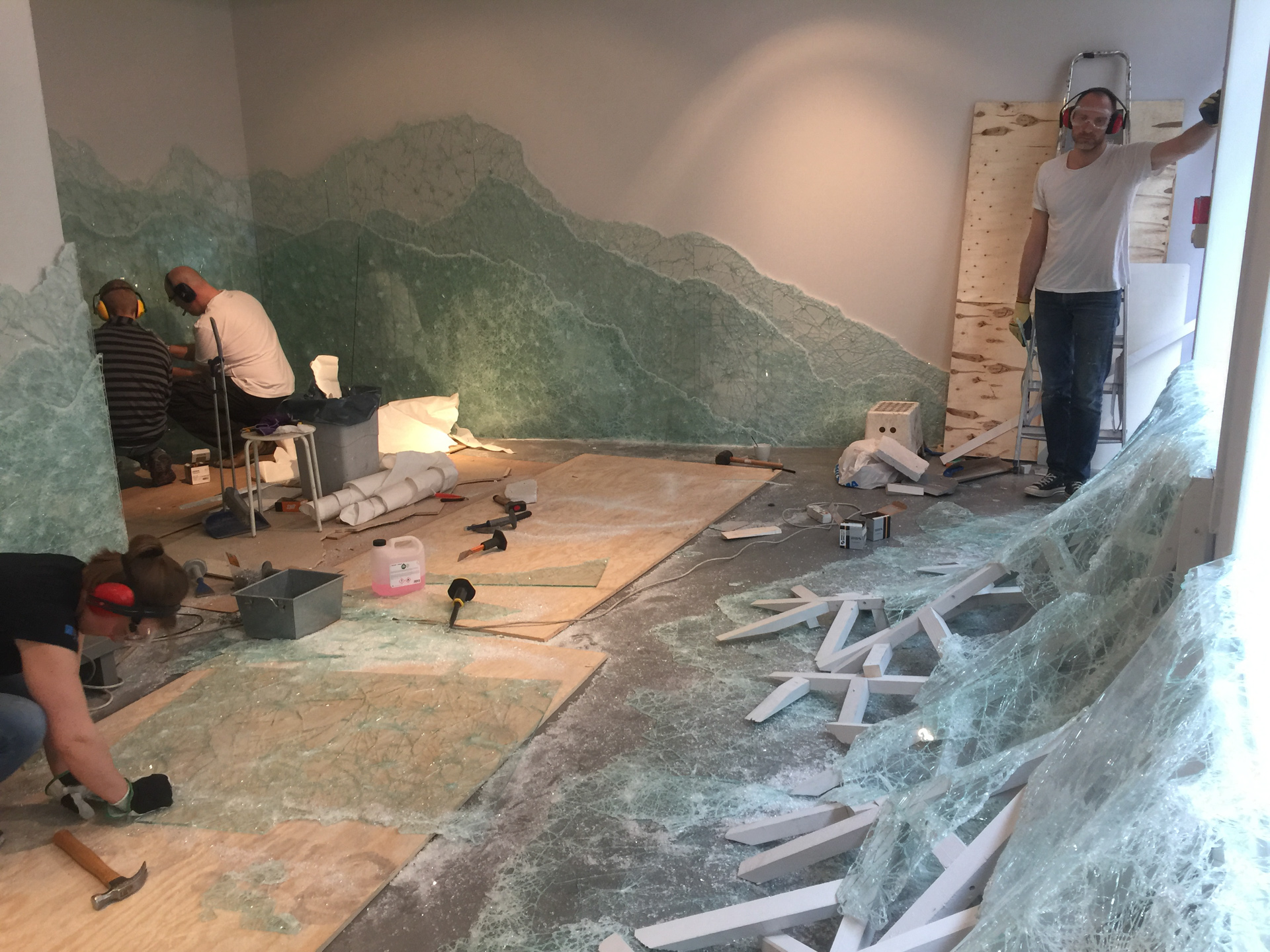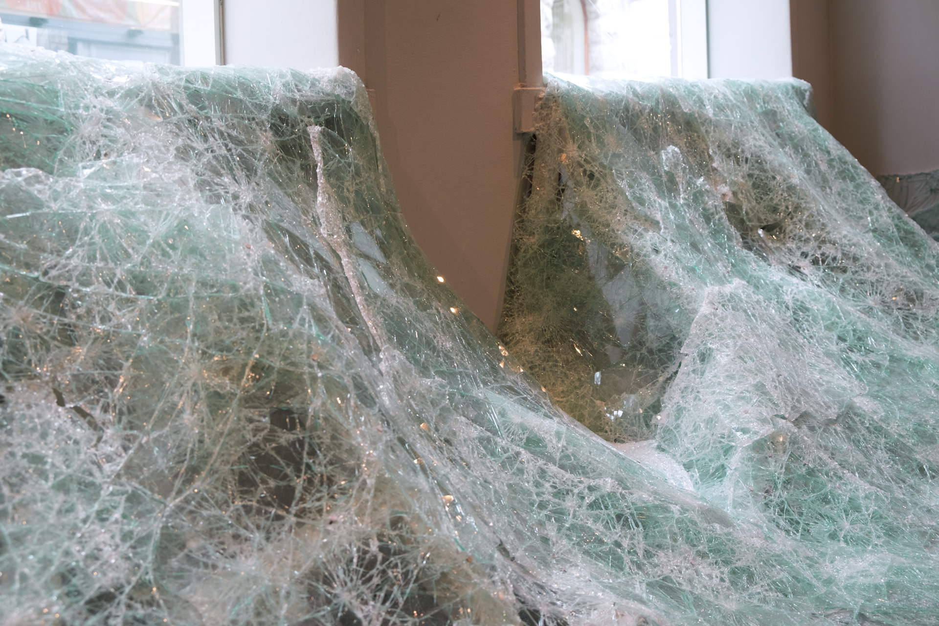 In S12 Baptiste Debombourg has made a brand-new installation– where the energy and power of dreams are a central theme. Debombourg is normally working with different materials and techniques, but prefers the ones we are surrounded by in our daily life. In this installation, remodeled sheets of broken laminated glass, reminding us of the destructive abilities of natural forces, are taking over the gallery. Through his unique and eye catching artworks he is making the viewer experience the surroundings in a different way.