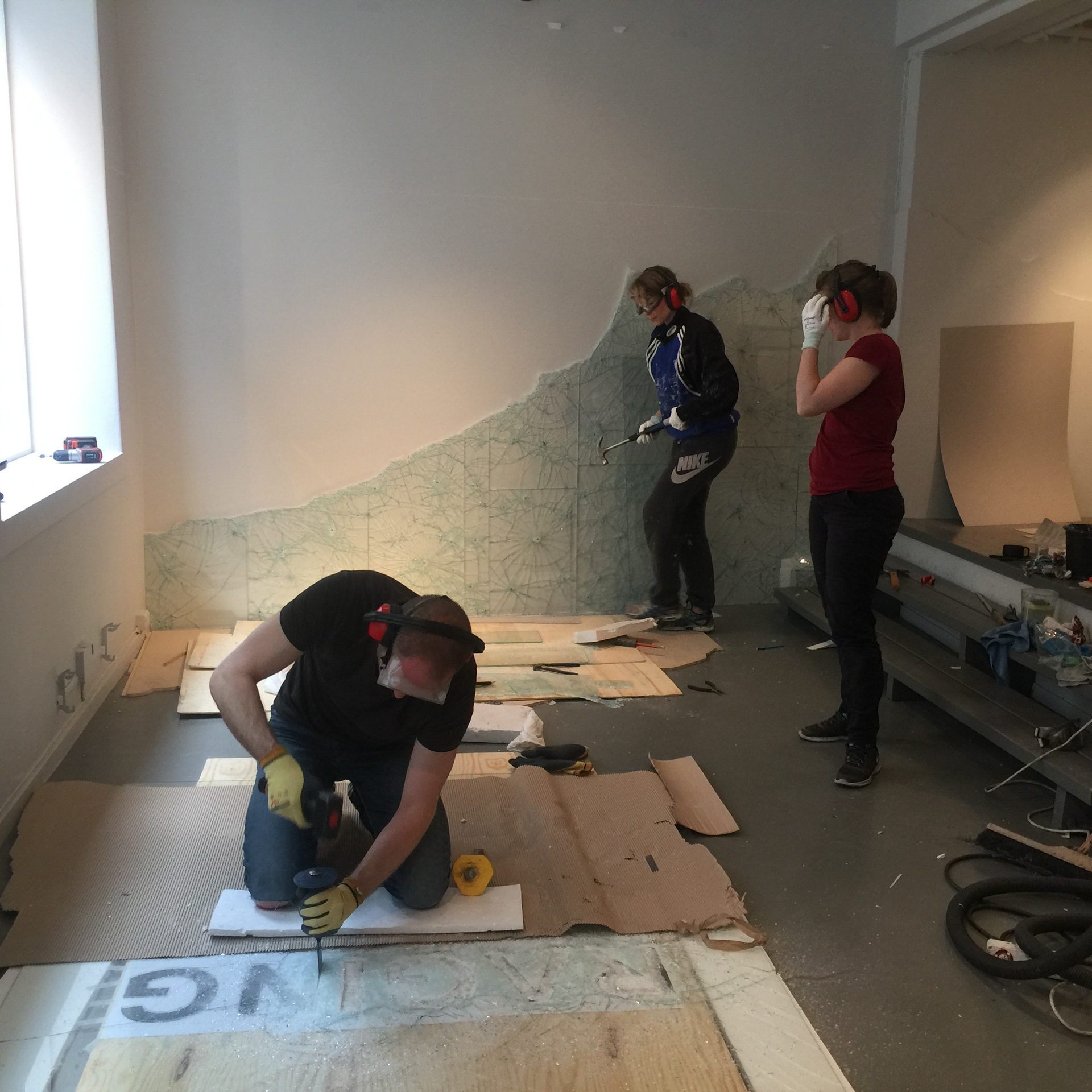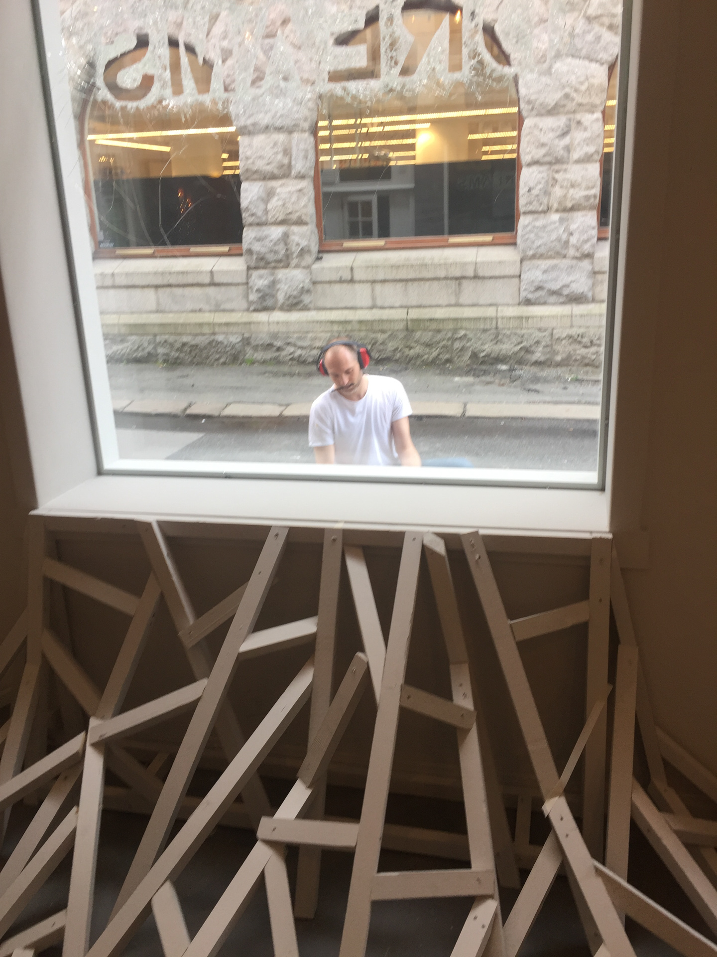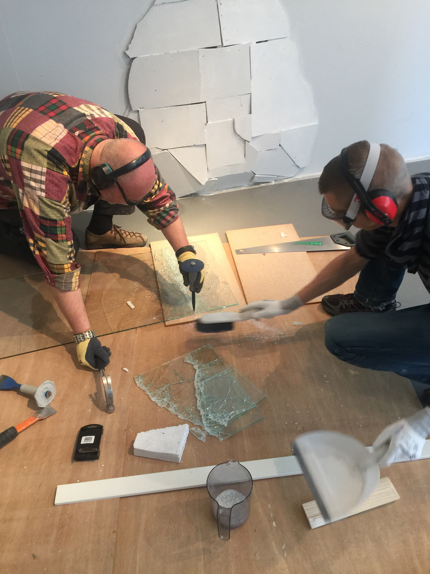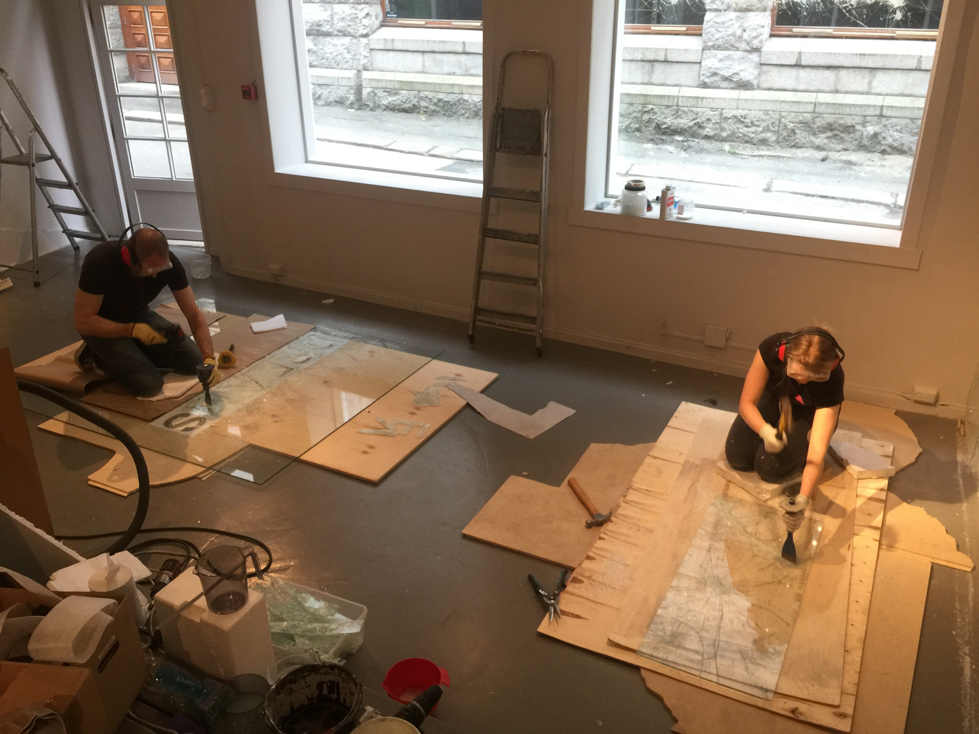 In S12 Baptiste Debombourg has made a brand-new installation– where the energy and power of dreams are a central theme. Debombourg is normally working with different materials and techniques, but prefers the ones we are surrounded by in our daily life. In this installation, remodeled sheets of broken laminated glass, reminding us of the destructive abilities of natural forces, are taking over the gallery. Through his unique and eye catching artworks he is making the viewer experience the surroundings in a different way.