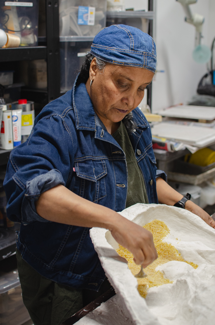 During her residency in S12 Mekdes worked on creating glass components for her project, “ጸጥታ” Tseteta, which combines ancient wisdom, healing practices, traditional design, and handcrafts to create a contemplative arena for storytelling. It features two clay and paper architectural structures adorned with copper-stained glass and thousands of glass beads. The project incorporates audio with nature sounds, spiritual melodies, andsun-themed paintings. By integrating traditional architecture, sound, and light, she aims to create a space that encourages connection, contemplation, and meaningful engagement.