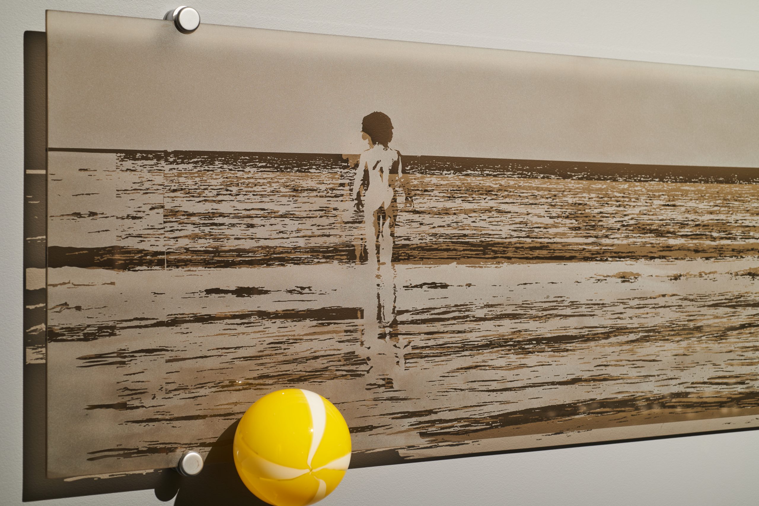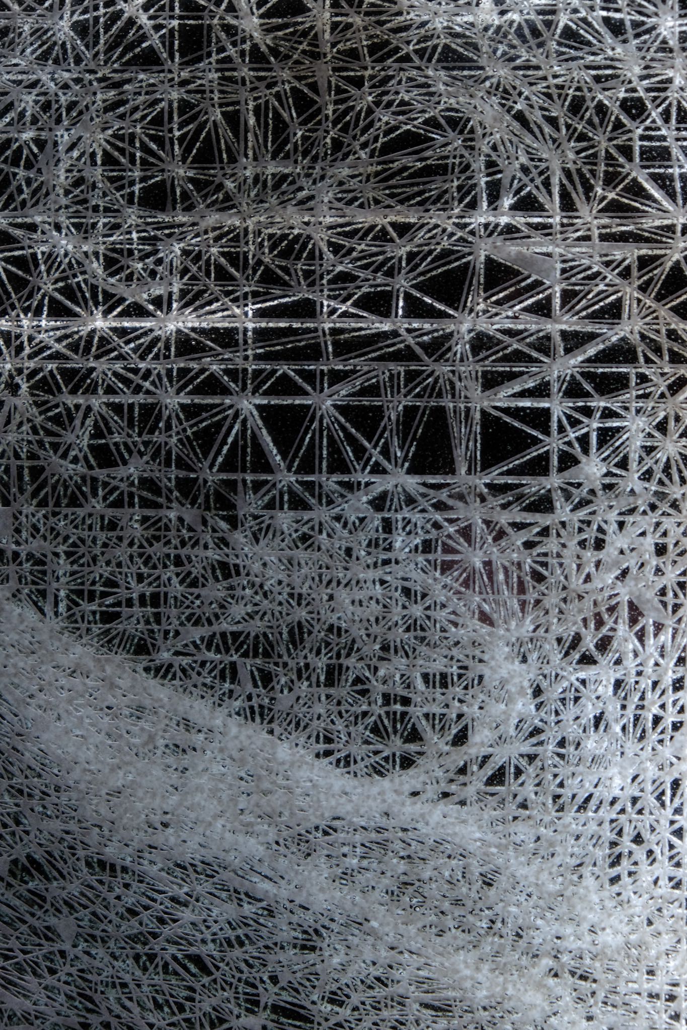 What does her art consist of? Observing the image, we immediately establish an understanding of a woman’s body. Although we read this as if it was a printout, through all the dividers that cut through her vertically and without regard to the curves and shapes of the human body, we see her as a whole. In these individual fields we become aware of the transitions, from one part of the body to another. This is how we are assembled. We are complex. Upon closer inspection, we also find a myriad of small fragments and intersecting lines in the surface of the glass, that form polygonal structures in a subtle network covering the entire female body. As if we studied her skin cells up close. These thin, fragile lines on the surface tie her together in an impossible puzzle. At the same time, they leave fine scratches in the surface of the glass as nerves in a cobweb, like stitches in a yarn, or traces of a fingerprint. This makes her different. Like everyone else, but not like others.