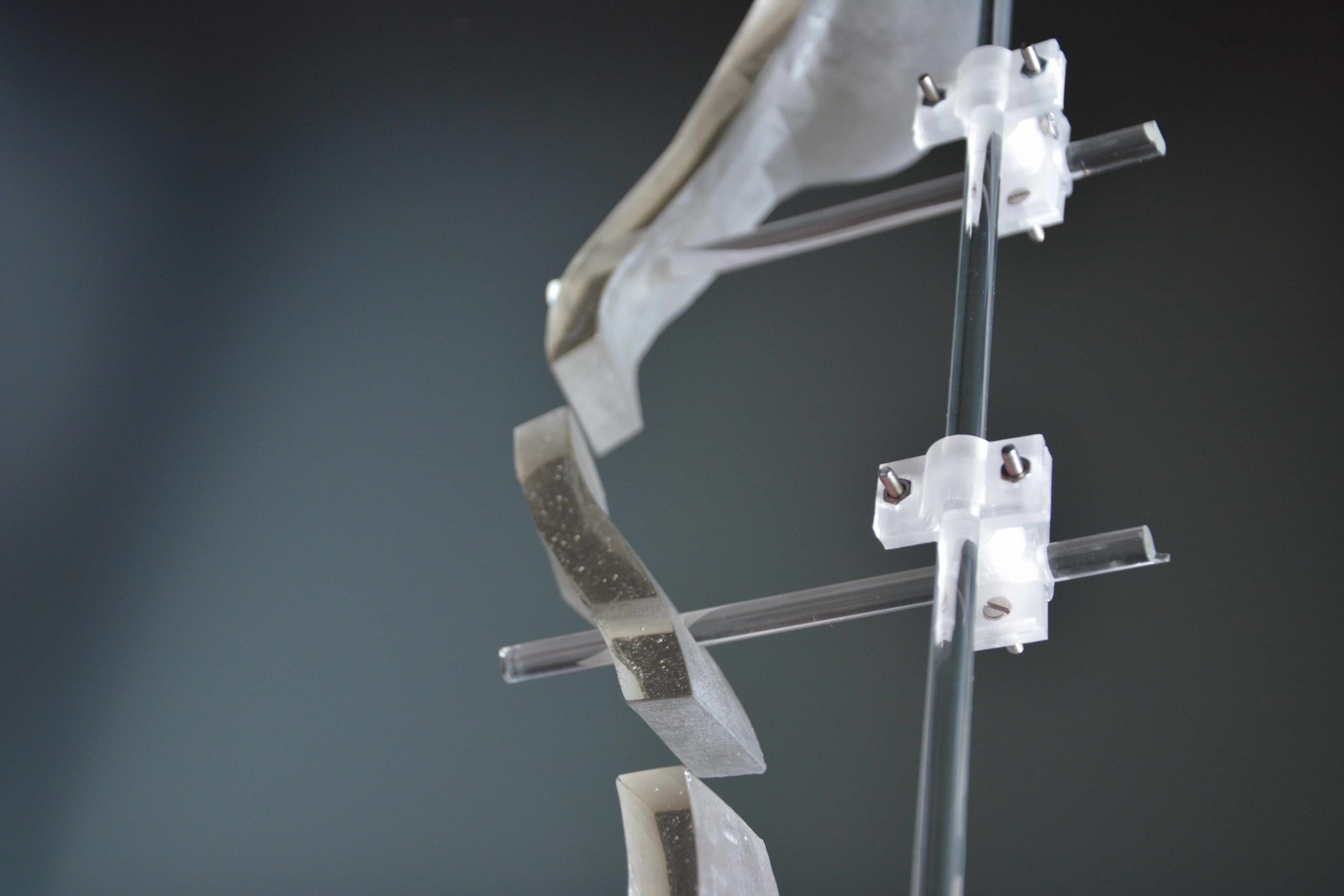 In the sculpture we find elements of glass modeled to represent fragments of a body with its rib cage and the vertebrae in a spine. They appear, exhibited in such a way, as abstract elements of a larger but absent sculpture. Looking for the missing parts, we become aware of the so-called negative space around them. A subtle scaffolding of interconnected, horizontal and vertical transparent glass tubes, carries the fragments of bone, as if they were free standing, or floating in thin air. The network of glass and rods reminds us of the schematic fields that also divide the image into its sections. We can similarly in the sculpture study the individual components of what we recognize as the very core of our own constitution. The skeleton. The glass tubes with their junctions, like the lines and fields in the image, assume their own beauty and convey an almost invisible, yet sophisticated distribution of function in mobility and support. As if it could not have been assembled in any other way.