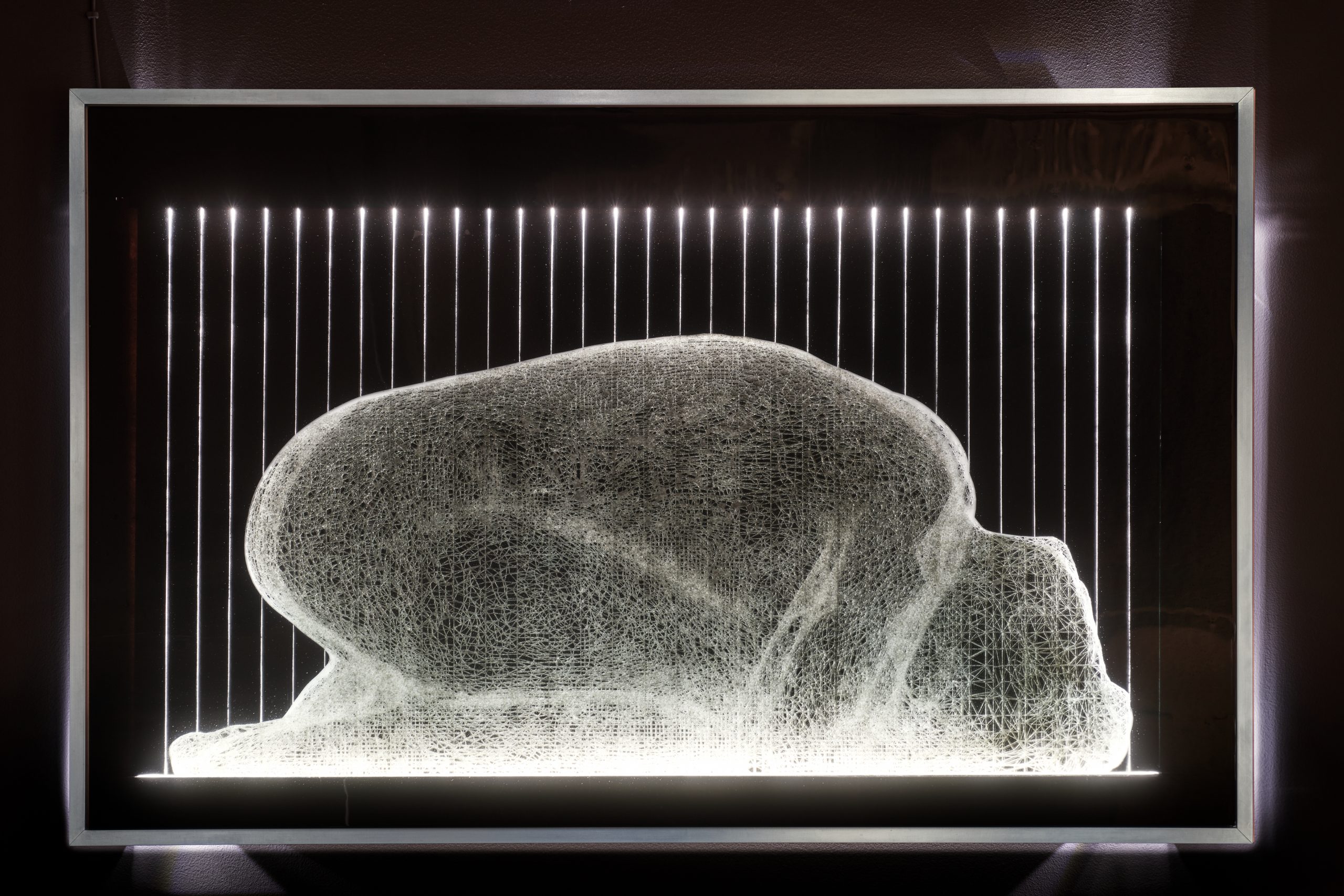 Æsa Björk’s composite work Fractures, from 2017 shows a three-dimensional scan of a woman’s body lying on her knees and reproduced in glass. The artwork with its two units consists of a sculpture showing fragments of a body with its skeleton held up, and together in a delicate framework, and a picture reminiscent of an X-ray photo of the kneeling woman. In this image we also see a series of parallel lines that divides the woman’s anatomy into 31 vertical sections.