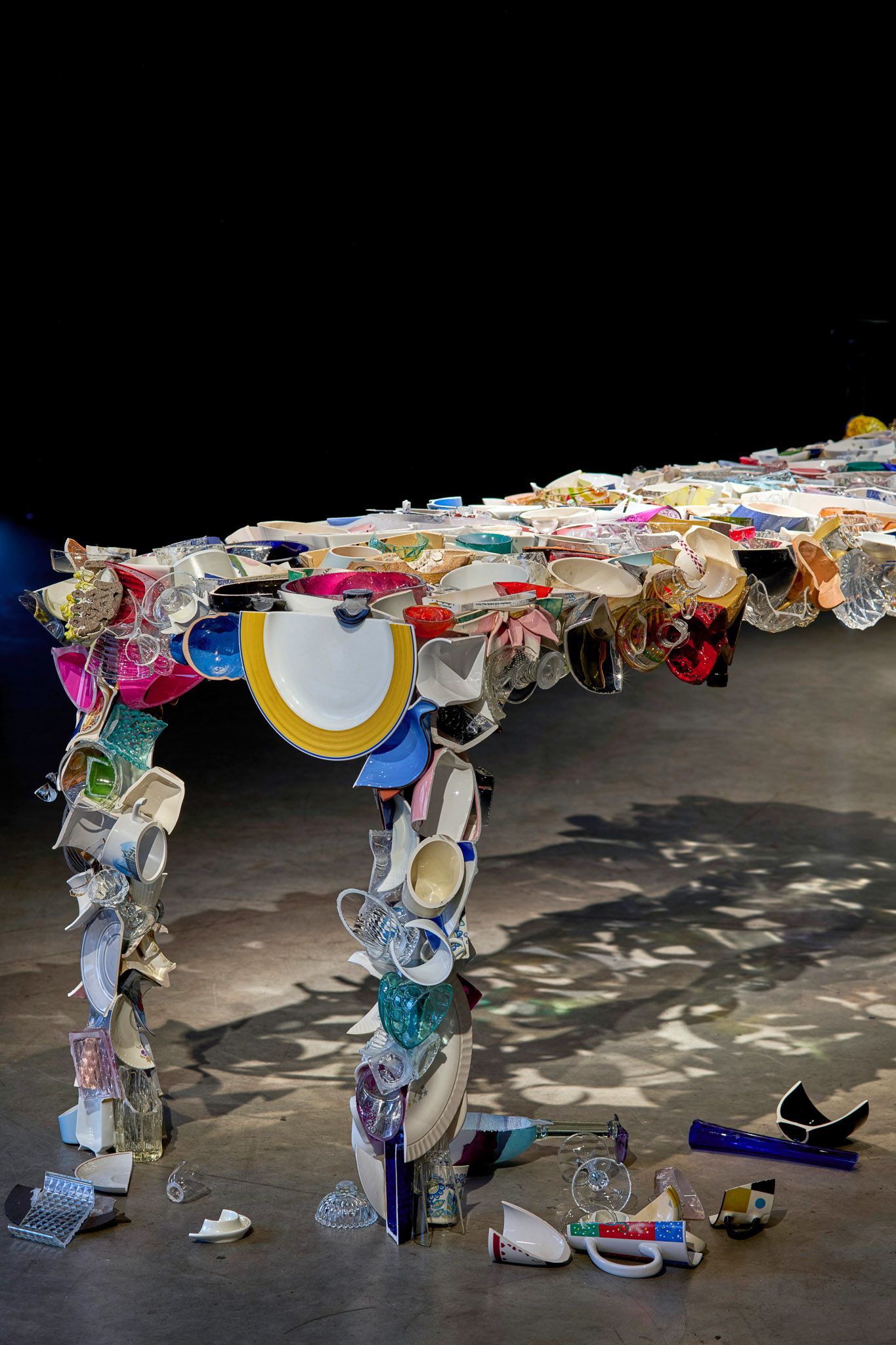 All the resulting objects now come together in a collective installation at S12, curated by Beth Lipman. The outcome is a table covered with objects that each represent an artist’s presence, absence, and interpretation — a collective conversation in glass. Alongside this installation, another sculpture is presented, composed of donated objects in glass, ceramic, and stoneware that have been cut, reshaped, and fused together into the form of a table.
