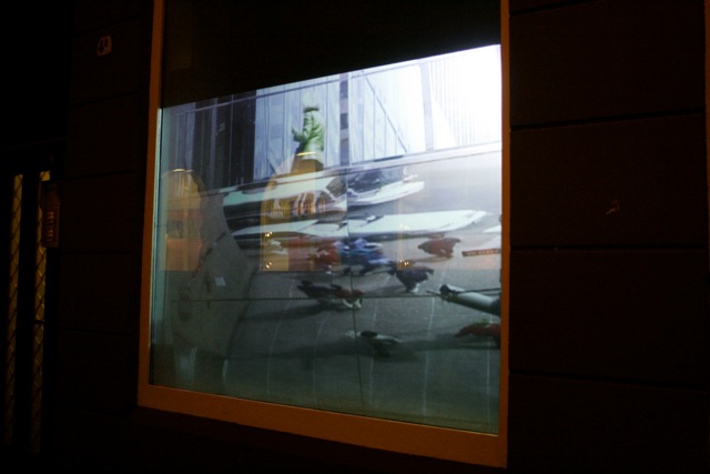In the catalogue for the exhibition, Andrea Krognes writes: “the video shows the reflecting glass and mirrored surfaces of New York’s mid-town district. We see people moving in front of, between, or behind these dazzling architectonic shells. The human figures lose something of their defining contours and melt and multiply into psychedelic ornaments. It is as if they were losing their bodily integration and slowly melting away. This fragmentation, distortion, multiplication, and disarrangement of people and space negates the idea of bounded or spatial anchored identity. These pictures radiate the power of the drifting and impenetrably flat and glossy images of our society of spectacle, in which no area of experience remains untouched by the capitalist process of commodification, the accelerated production and consumption of gadgets, entertainment and lifestyles.”